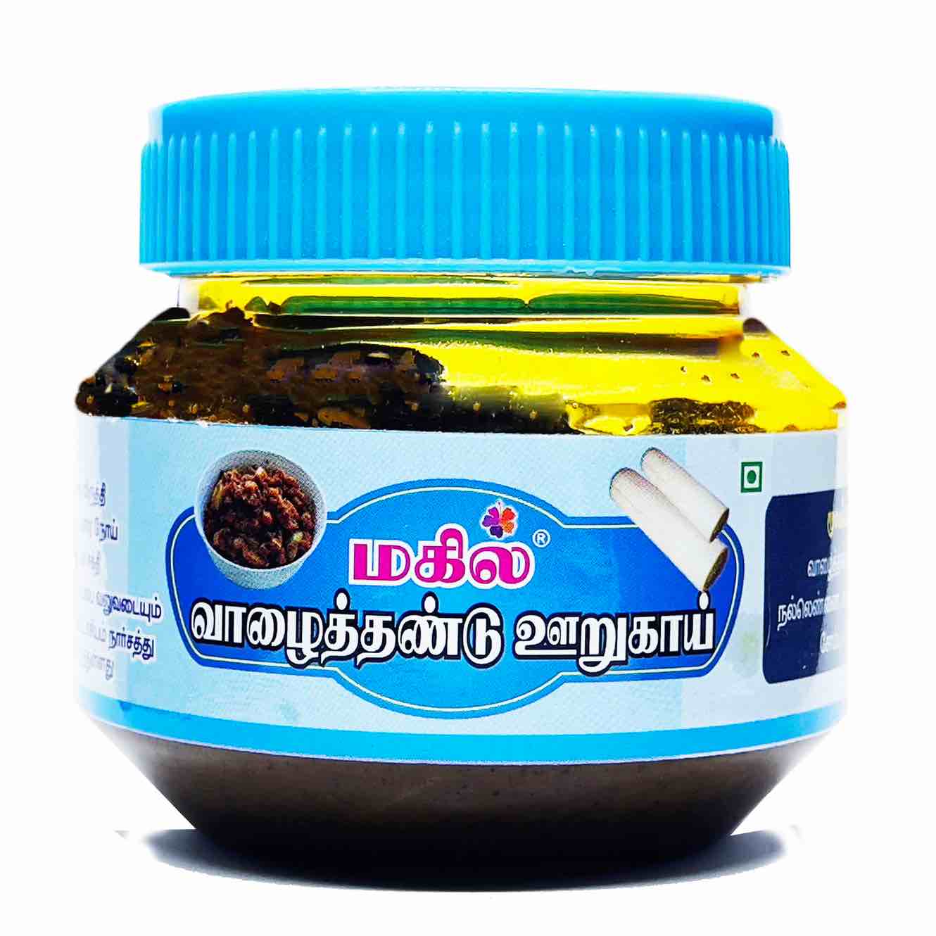 Pickles are one of the best side dishes for everyone. Pickles originated in India, primarily in South India. Oil and salt are used to preserve them. We can make pickles with our favorite vegetables. Mahil plantain stem pickle is made with gingelly oil, coriander, fenugreek, anise, cumin, pepper, and garlic. The processing of plantain stems is a major activity. There is abundant fiber and potassium in plantain stems. These stems have many health benefits. They cure acidity, relieve body heat, retain minerals, enhance memory, and improve digestion. It can be eaten with idly, dosa, chapati, or rice.