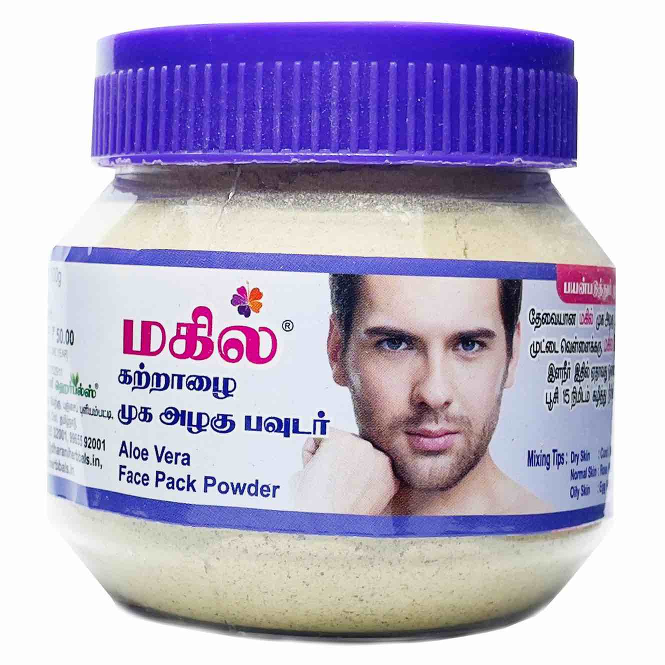 Mahil Aloe vera face pack powder is specially made for men. This powder contains Aloe vera, tulsi, rose, white turmeric, wormwood, fenugreek, green gram, sandalwood, almond, and others. It makes the skin soft, fresh, and free from pimples, and it eliminates dark spots and black spots.