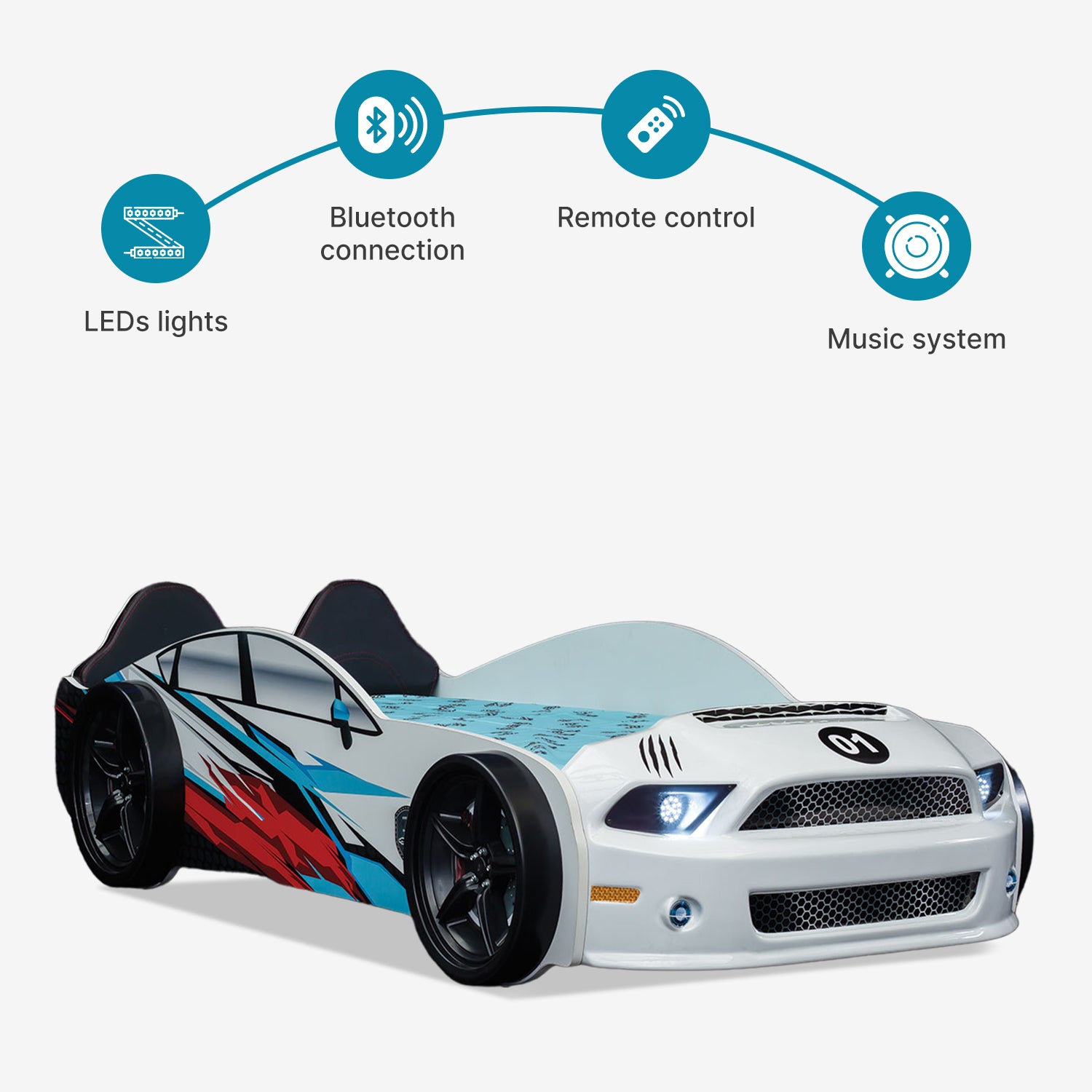 Each bed comes with built-in LED headlights and underbody lighting that makes the car glow at night. These lights not only add charm but can also function as a night lamp, offering comfort to kids who are afraid of the dark.